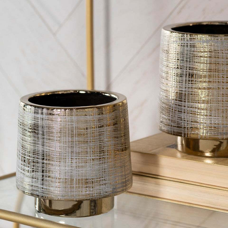 The Crestview Collection Beacon Vases come in a set of three in varied sizes. The ceramic glass has been finished with a gold toned base and them it looks like a loosely woven fabric has been placed over the gold so that it glistens through the grid of the cream colored threads. These vases are the ideal size to set a potted plant into or for a low rising floral arrangement in the middle of a table where you want your guests to be able to visit with each other since the tallest vase is 7-inches tall.